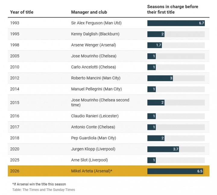 若本赛季阿尔特塔率阿森纳问鼎英超,这将成为英超时代除弗格森爵士(曼联)外,俱乐部等待主帅首夺联赛冠军最久的案例。
