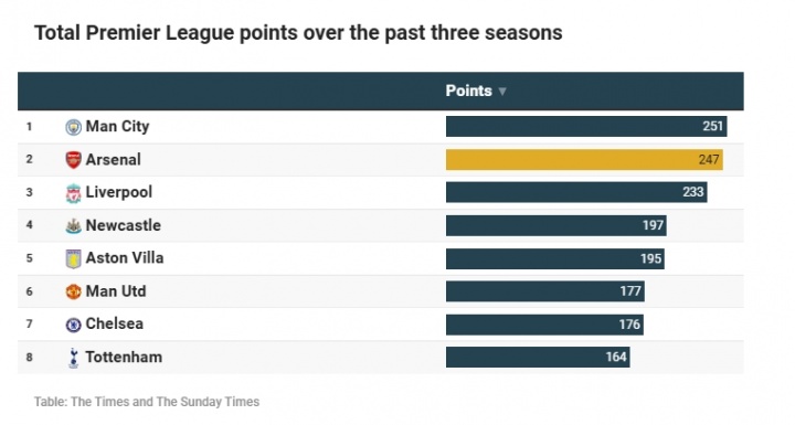 英超球队近三个赛季积分总和↓