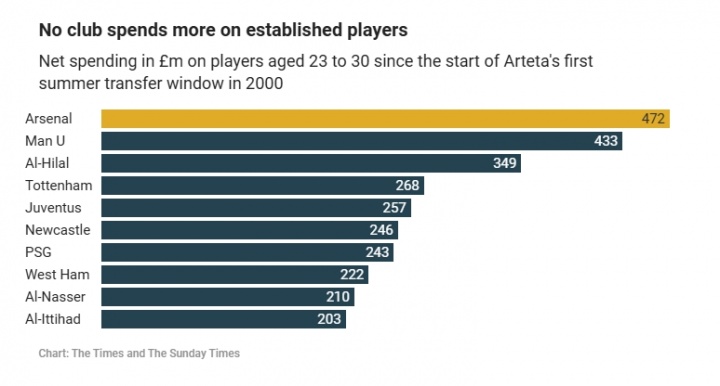 自阿尔特塔2020年夏首度执掌转会窗以来,各队成熟年龄段(23-30岁)球员净支出对比↓