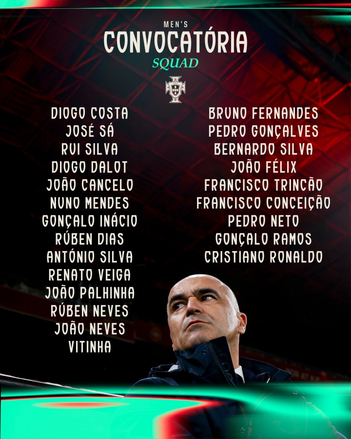 葡萄牙世预赛名单:C罗领衔,B费、菲利克斯、坎塞洛入选