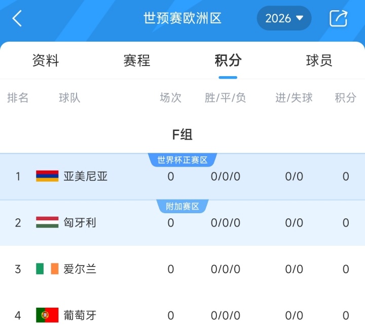 9月份的世预赛比赛中,葡萄牙将先后在客场对阵亚美尼亚和匈牙利;本届世预赛中,葡萄牙与亚美尼亚、匈牙利、爱尔兰一同分在F组。